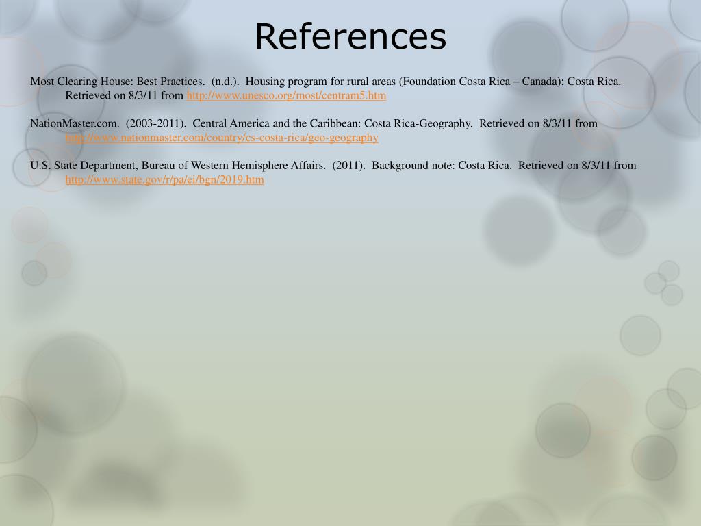 References Most Clearing House: Best Practices. (n.d.). Housing program for rural areas (Foundation Costa Rica – Canada): Costa Rica. Retrieved on 8/3/11 from http://www.unesco.org/most/centram5.htm NationMaster.com. (2003-2011). Central America and the Caribbean: Costa Rica-Geography. Retrieved on 8/3/11 from http://www.nationmaster.com/country/cs-costa-rica/geo-geography U.S. State Department, Bureau of Western Hemisphere Affairs. (2011). Background note: Costa Rica. Retrieved on 8/3/11 from http://www.state.gov/r/pa/ei/bgn/2019.htm