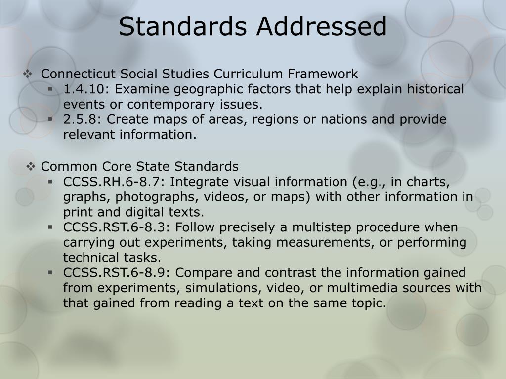 Standards Addressed • Connecticut Social Studies Curriculum Framework • 1.4.10: Examine geographic factors that help explain historical events or contemporary issues. • 2.5.8: Create maps of areas, regions or nations and provide relevant information. • Common Core State Standards • CCSS.RH.6-8.7: Integrate visual information (e.g., in charts, graphs, photographs, videos, or maps) with other information in print and digital texts. • CCSS.RST.6-8.3: Follow precisely a multistep procedure when carrying out experiments, taking measurements, or performing technical tasks. • CCSS.RST.6-8.9: Compare and contrast the information gained from experiments, simulations, video, or multimedia sources with that gained from reading a text on the same topic.