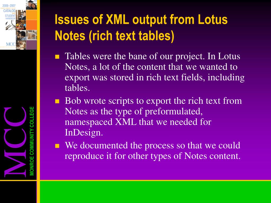 Issues of XML output from Lotus Notes (rich text tables) • Tables were the bane of our project. In Lotus Notes, a lot of the content that we wanted to export was stored in rich text fields, including tables. • Bob wrote scripts to export the rich text from Notes as the type of preformulated, namespaced XML that we needed for InDesign. • We documented the process so that we could reproduce it for other types of Notes content.