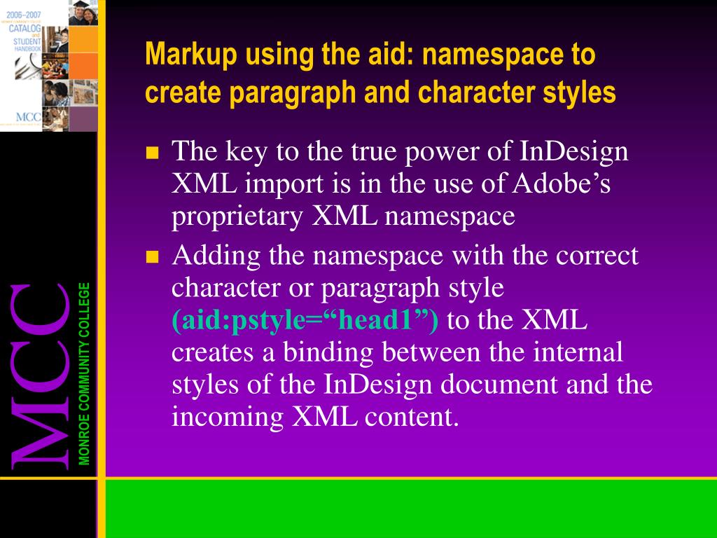 Markup using the aid: namespace to create paragraph and character styles • The key to the true power of InDesign XML import is in the use of Adobe’s proprietary XML namespace • Adding the namespace with the correct character or paragraph style (aid:pstyle=“head1”) to the XML creates a binding between the internal styles of the InDesign document and the incoming XML content.
