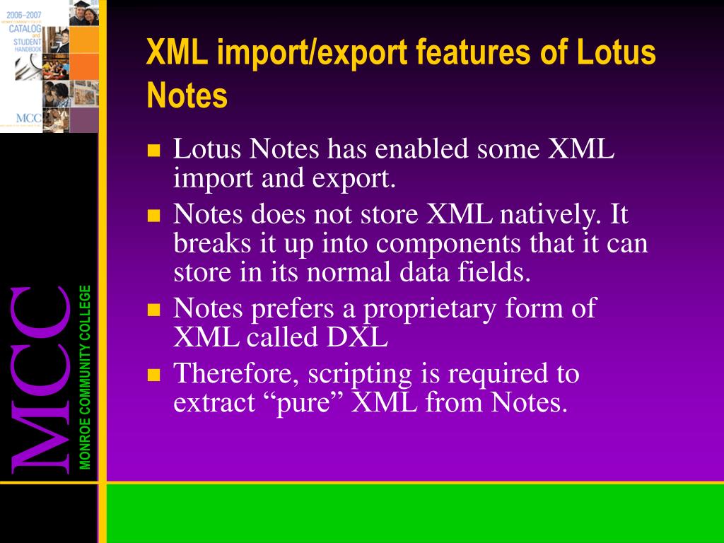 XML import/export features of Lotus Notes • Lotus Notes has enabled some XML import and export. • Notes does not store XML natively. It breaks it up into components that it can store in its normal data fields. • Notes prefers a proprietary form of XML called DXL. • Scripting is required to extract “pure” XML from Notes.