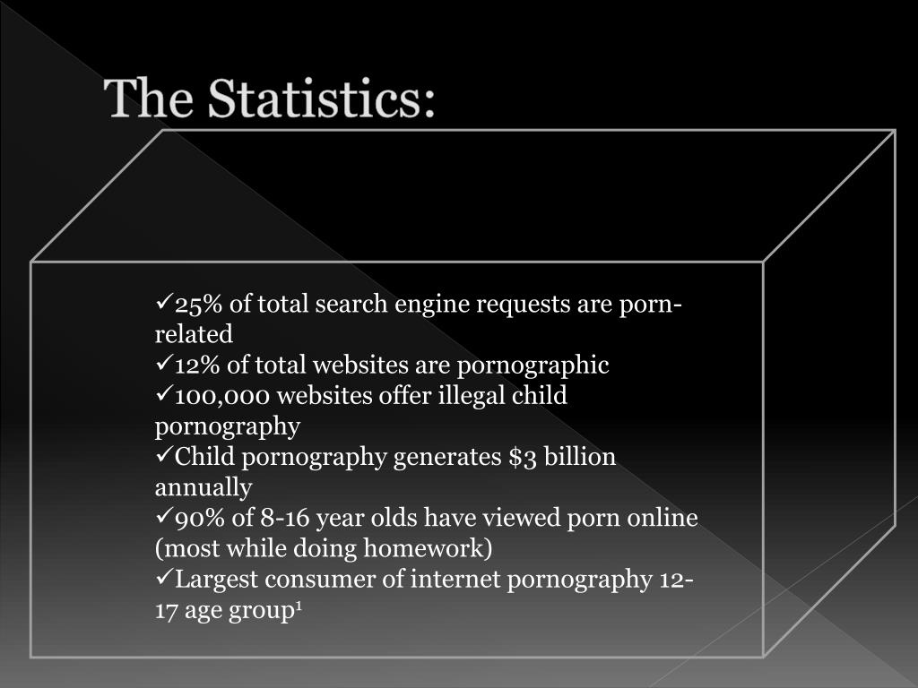 The Statistics: • 25% of total search engine requests are porn-related • 12% of total websites are pornographic • 100,000 websites offer illegal child pornography • Child pornography generates $3 billion annually • 90% of 8-16 year olds have viewed porn online (most while doing homework) • Largest consumer of internet pornography 12-17 age group1