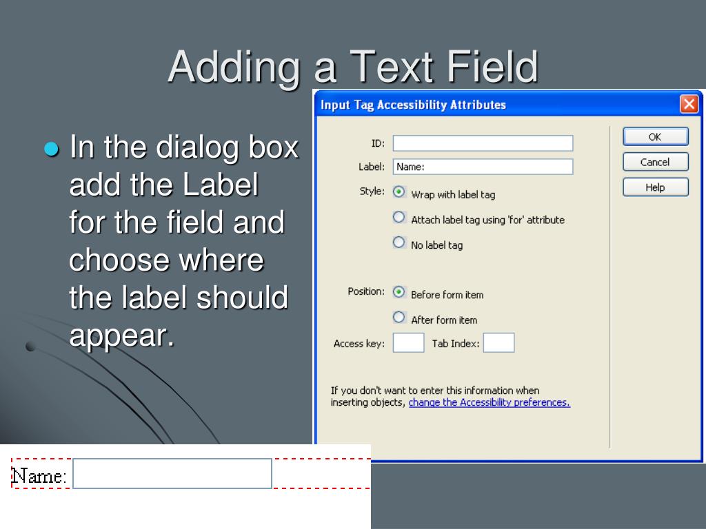 Adding a Text Field • In the dialog box add the Label for the field and choose where the label should appear.