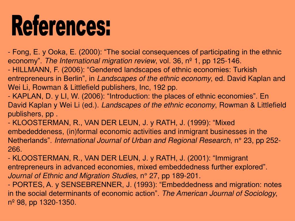 References: • PORTES, A. (1995): “``Economic sociology and the sociology of immigration: a conceptual overview”, in Alejandro Portes (editor): The Economic Sociology of Immigration: Essays on Networks, Ethnicity and Entrepreneurship, Russell Sage Foundation. • PORTES, A. (1998): Social Capital: Its Origins and Applications in Modern Sociology, Annual Review of Sociology, Vol. 24. (1998), pp. 1-24. • STARING, R. (2000): “Flows of people: globalization, migration and transnational communities” in The ends of Globalisation: bringing society back, ed. Don Kalb, Marco Van der Land, Richard Staring, Bart Van Steenbergen y Nico Wilterdink, Lanham, Rowman and Littlefield, pp 203-216. • - VOLERY, T. (2007): ”Ethnic entrepreneurship: a theoretical framework”. En Leo Paul Dana (ed.). Handbook of research on ethnic minority entrepreneurship, Edward Elgar Publishing Limited, pp 30-41. • - WALDINGER, R. (1984): “Immigrant enterprise in the New York garment industry”. Social Problems, n° 32, pp 60-71. • - WILPERT, C. (2003): “Germany: from workers to entrepreneurs” en Immigrant entrepreneurs: venturing abroad in the age of globalization. In Robert Kloosterman y Jan Rath (ed.), Berg Publishers, chapter 12. • - WOOLCOCK, M. (1998): “Social capital and economic development: toward a theoretical synthesis and policy framework”. Theory and Society, vol. 27, pp 151-208.