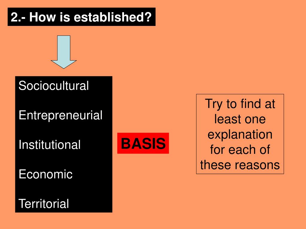 2.- How is established? Sociocultural Entrepreneurial Institutional Economic Territorial Try to find at least one explanation for each of these reasons BASIS