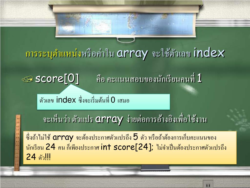 การระบุตำแหน่งหรือค่าใน array จะใช้ตัวเลข index • score[0] คือ คะแนนสอบของนักเรียนคนที่ 1 จะเห็นว่า ตัวแปร array ง่ายต่อการอ้างอิงเพื่อใช้งาน ตัวเลขindex ซึ่งจะเริ่มต้นที่ 0 เสมอ ซึ่งถ้าไม่ใช้ array จะต้องประกาศตัวแปรถึง 5 ตัว หรือถ้าต้องการเก็บคะแนนของนักเรียน 24 คน ก็เพียงประกาศ int score[24]; ไม่จำเป็นต้องประกาศตัวแปรถึง 24 ตัว!!!