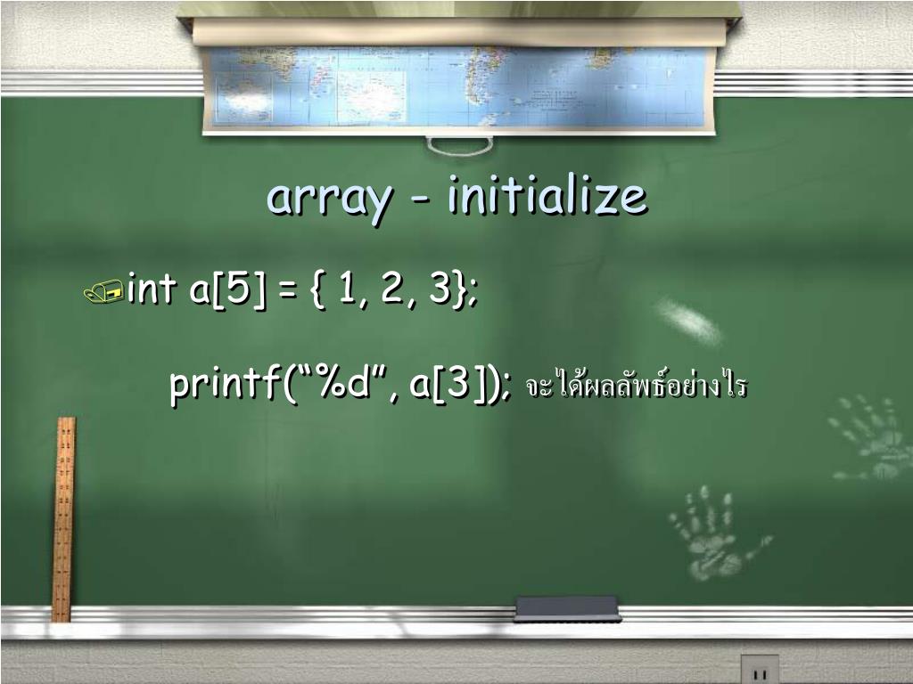 array - initialize int a[5] = { 1, 2, 3}; printf(“%d”, a[3]); จะได้ผลลัพธ์อย่างไร
