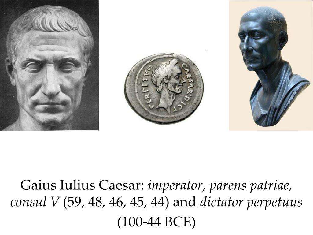 Gaius IuliusCaesar: imperator, parenspatriae, consul V (59, 48, 46, 45, 44) and dictator perpetuus (100-44 BCE)