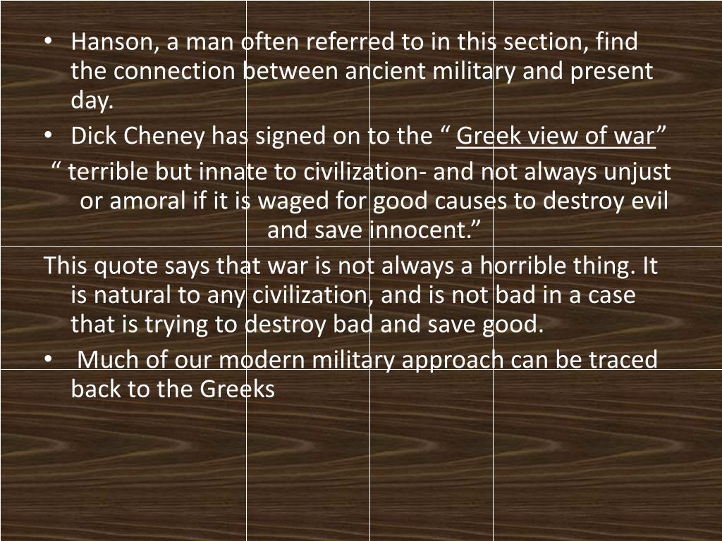 Hanson, a man often referred to in this section, find the connection between ancient military and present day. • Dick Cheney has signed on to the “ Greek view of war” “ terrible but innate to civilization- and not always unjust or amoral if it is waged for good causes to destroy evil and save innocent.” This quote says that war is not always a horrible thing. It is natural to any civilization, and is not bad in a case that is trying to destroy bad and save good. • Much of our modern military approach can be traced back to the Greeks