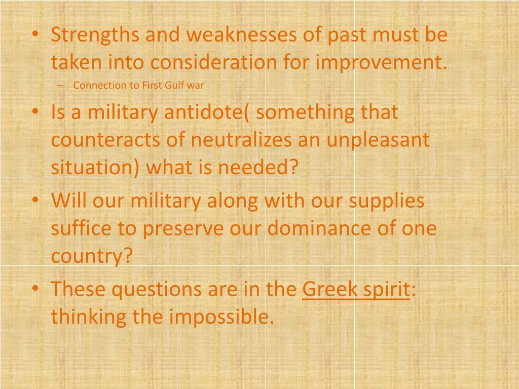 Strengths and weaknesses of past must be taken into consideration for improvement. • Connection to First Gulf war • Is a military antidote( something that counteracts of neutralizes an unpleasant situation) what is needed? • Will our military along with our supplies suffice to preserve our dominance of one country? • These questions are in the Greek spirit: thinking the impossible.