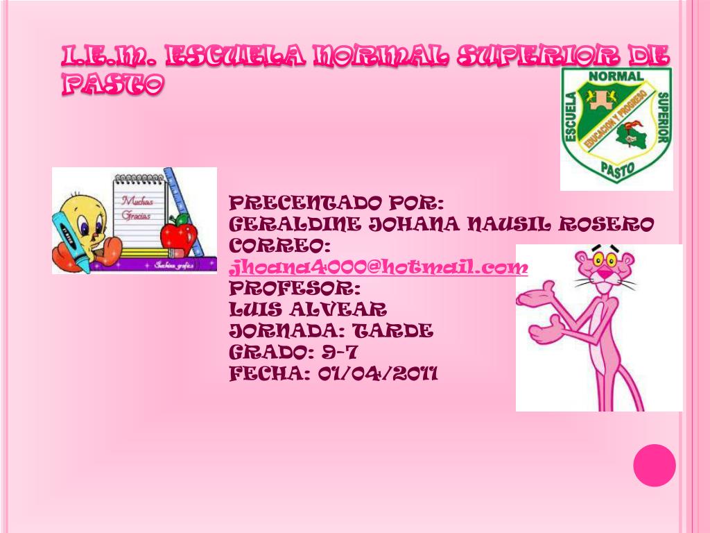 I.E.M. ESCUELA NORMAL SUPERIOR DE PASTO PRECENTADO POR: GERALDINE JOHANA NAUSIL ROSERO CORREO: jhoana4000@hotmail.com PROFESOR: LUIS ALVEAR JORNADA: TARDE GRADO: 9-7 FECHA: 01/04/2011