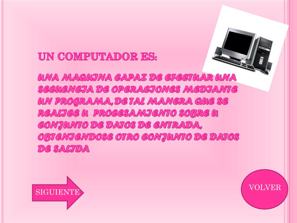UN COMPUTADOR ES: UNA MAQUINA CAPAZ DE EFECTUAR UNA SECUENCIA DE OPERACIONES MEDIANTE UN PROGRAMA, DE TAL MANERA QUE SE REALICE U PROCESAMIENTO SOBRE U CONJUNTO DE DATOS DE ENTRADA, OBTENIENDOSE OTRO CONJUNTO DE DATOS DE SALIDA VOLVER SIGUIENTE