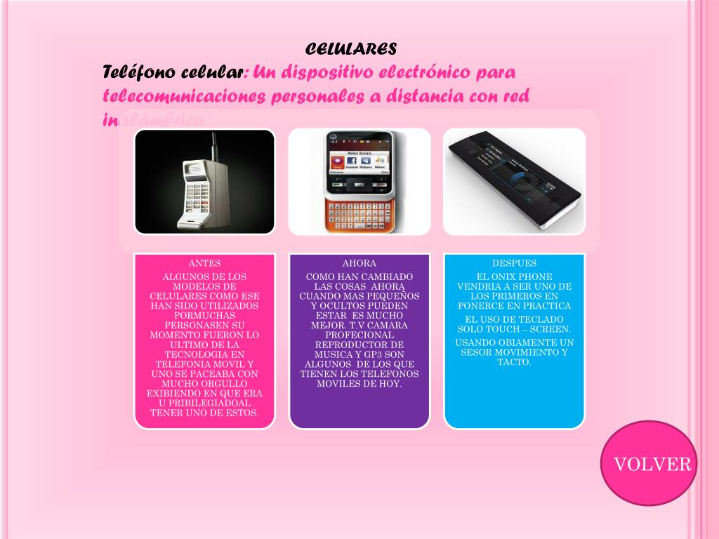 CELULARES Teléfono celular: Un dispositivo electrónico para telecomunicaciones personales a distancia con red inalámbrica VOLVER