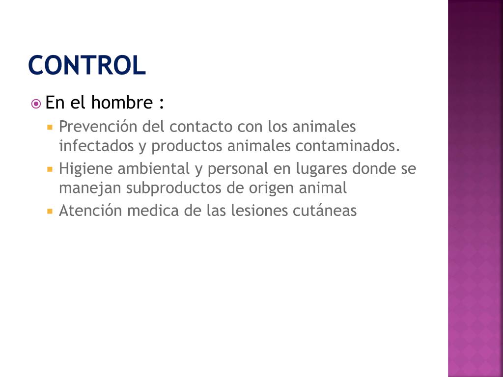Control • En el hombre : • Prevención del contacto con los animales infectados y productos animales contaminados. • Higiene ambiental y personal en lugares donde se manejan subproductos de origen animal • Atención medica de las lesiones cutáneas