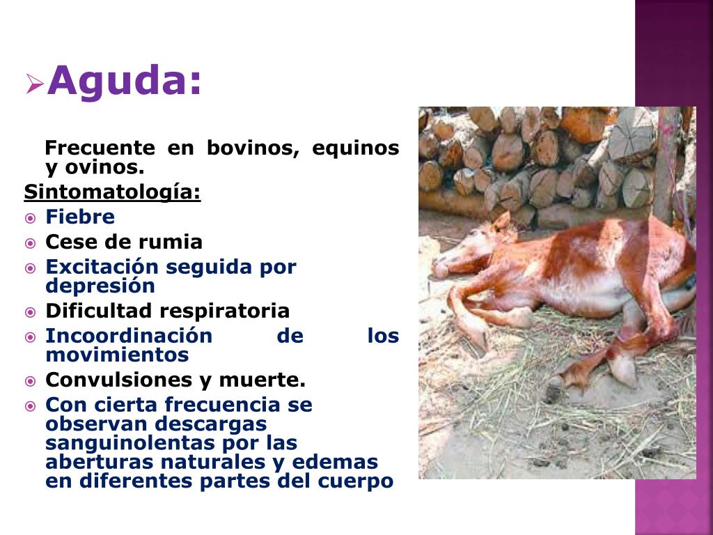 Aguda: Frecuente en bovinos, equinos y ovinos. Sintomatología: • Fiebre • Cese de rumia • Excitación seguida por depresión • Dificultad respiratoria • Incoordinación de los movimientos • Convulsiones y muerte. • Con cierta frecuencia se observan descargas sanguinolentas por las aberturas naturales y edemas en diferentes partes del cuerpo