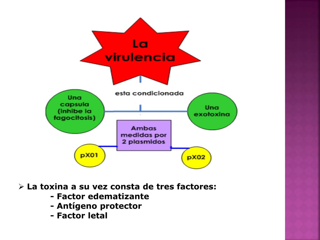 La toxina a su vez consta de tres factores: • - Factor edematizante • - Antígeno protector • - Factor letal