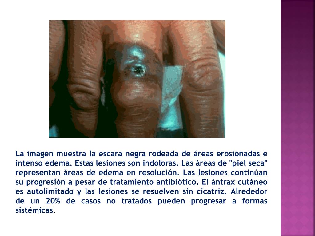 La imagen muestra la escara negra rodeada de áreas erosionadas e intenso edema. Estas lesiones son indoloras. Las áreas de "piel seca" representan áreas de edema en resolución. Las lesiones continúan su progresión a pesar de tratamiento antibiótico. El ántrax cutáneo es autolimitado y las lesiones se resuelven sin cicatriz. Alrededor de un 20% de casos no tratados pueden progresar a formas sistémicas.