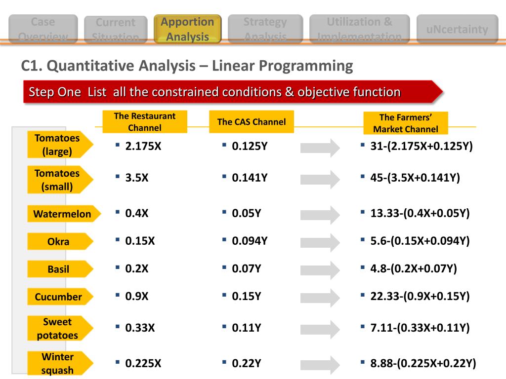 Apportion Analysis Case Overview Strategy Analysis Utilization & Implementation uNcertainty Current Situation C1. Quantitative Analysis – Linear Programming Step One List all the constrained conditions & objective function The Restaurant Channel The CAS Channel The Farmers’ Market Channel Tomatoes (large) • 2.175X • 0.125Y • 31-(2.175X+0.125Y) Tomatoes (small) • 3.5X • 0.141Y • 45-(3.5X+0.141Y) • 0.4X • 0.05Y • 13.33-(0.4X+0.05Y) Watermelon • 0.15X • 0.094Y • 5.6-(0.15X+0.094Y) Okra • 0.2X • 0.07Y • 4.8-(0.2X+0.07Y) Basil • 0.9X • 0.15Y • 22.33-(0.9X+0.15Y) Cucumber Sweet potatoes • 0.33X • 0.11Y • 7.11-(0.33X+0.11Y) Winter squash • 0.225X • 0.22Y • 8.88-(0.225X+0.22Y)