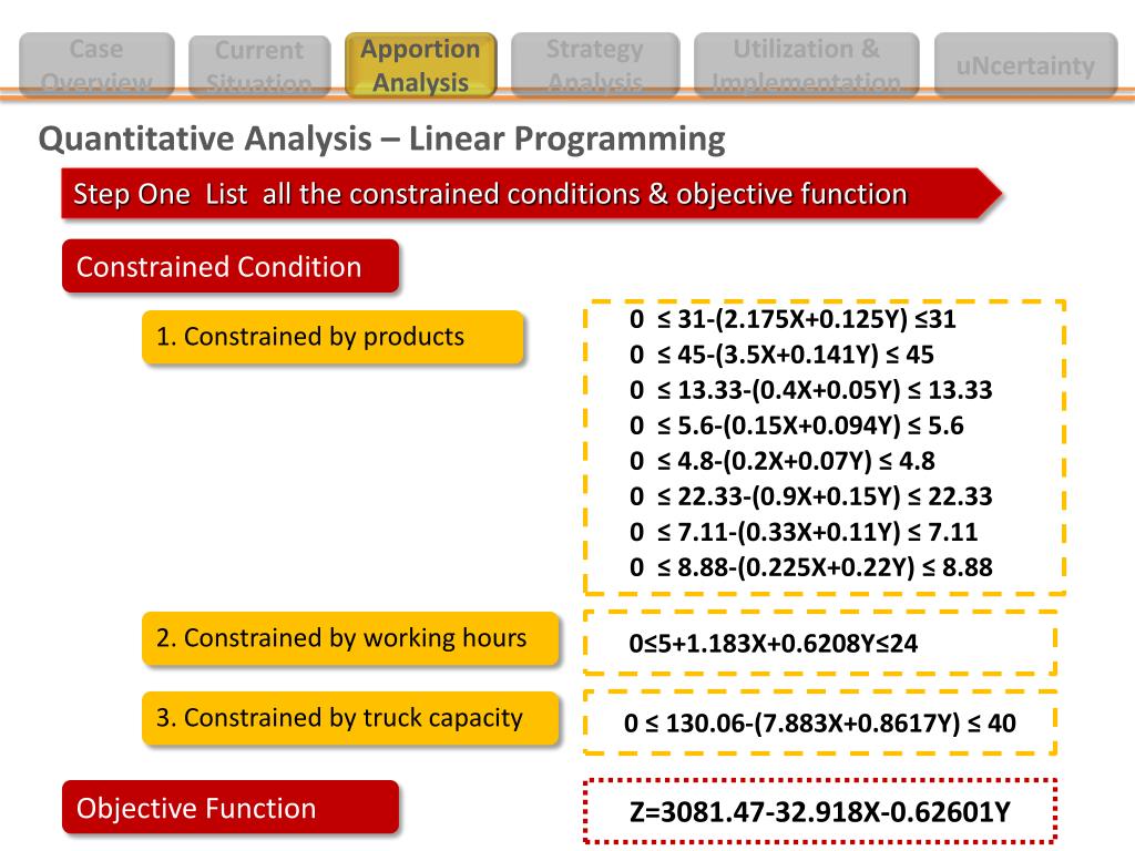 Apportion Analysis Case Overview Strategy Analysis Utilization & Implementation uNcertainty Current Situation Quantitative Analysis – Linear Programming Step One List all the constrained conditions & objective function Constrained Condition • 0 ≤ 31-(2.175X+0.125Y) ≤31 1. Constrained by products • 0 ≤ 45-(3.5X+0.141Y) ≤ 45 • 0 ≤ 13.33-(0.4X+0.05Y) ≤ 13.33 • 0 ≤ 5.6-(0.15X+0.094Y) ≤ 5.6 • 0 ≤ 4.8-(0.2X+0.07Y) ≤ 4.8 • 0 ≤ 22.33-(0.9X+0.15Y) ≤ 22.33 • 0 ≤ 7.11-(0.33X+0.11Y) ≤ 7.11 • 0 ≤ 8.88-(0.225X+0.22Y) ≤ 8.88 2. Constrained by working hours 0≤5+1.183X+0.6208Y≤24 3. Constrained by truck capacity 0 ≤ 130.06-(7.883X+0.8617Y) ≤ 40 Objective Function Z=3081.47-32.918X-0.62601Y