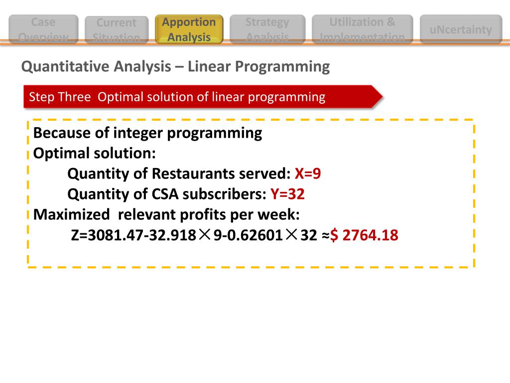 Apportion Analysis Case Overview Strategy Analysis Utilization & Implementation uNcertainty Current Situation Quantitative Analysis – Linear Programming Step Three Optimal solution of linear programming Because of integer programming Optimal solution: Quantity of Restaurants served: X=9 Quantity of CSA subscribers: Y=32 Maximized relevant profits per week: Z=3081.47-32.918×9-0.62601×32 ≈$ 2764.18
