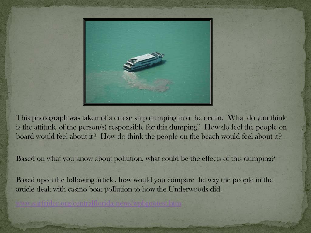 This photograph was taken of a cruise ship dumping into the ocean. What do you think is the attitude of the person(s) responsible for this dumping? How do feel the people on board would feel about it? How do think the people on the beach would feel about it? Based on what you know about pollution, what could be the effects of this dumping? Based upon the following article, how would you compare the way the people in the article dealt with casino boat pollution to how the Underwoods did. www.surfrider.org/centralflorida/news/wpbprotest.htm