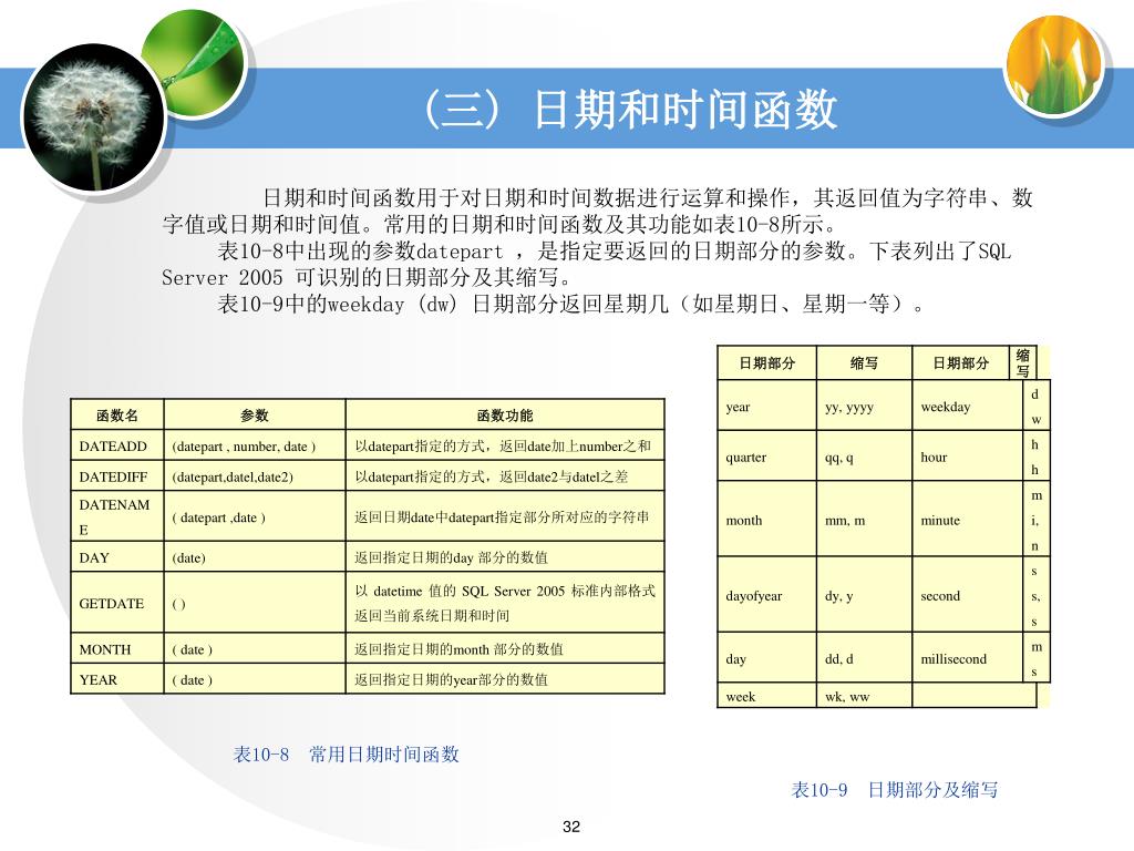 (三) 日期和时间函数 日期和时间函数用于对日期和时间数据进行运算和操作,其返回值为字符串、数字值或日期和时间值。常用的日期和时间函数及其功能如表10-8所示。 表10-8中出现的参数datepart ,是指定要返回的日期部分的参数。下表列出了SQL Server 2005 可识别的日期部分及其缩写。 表10-9中的weekday (dw) 日期部分返回星期几(如星期日、星期一等)。 表10-8 常用日期时间函数 表10-9 日期部分及缩写