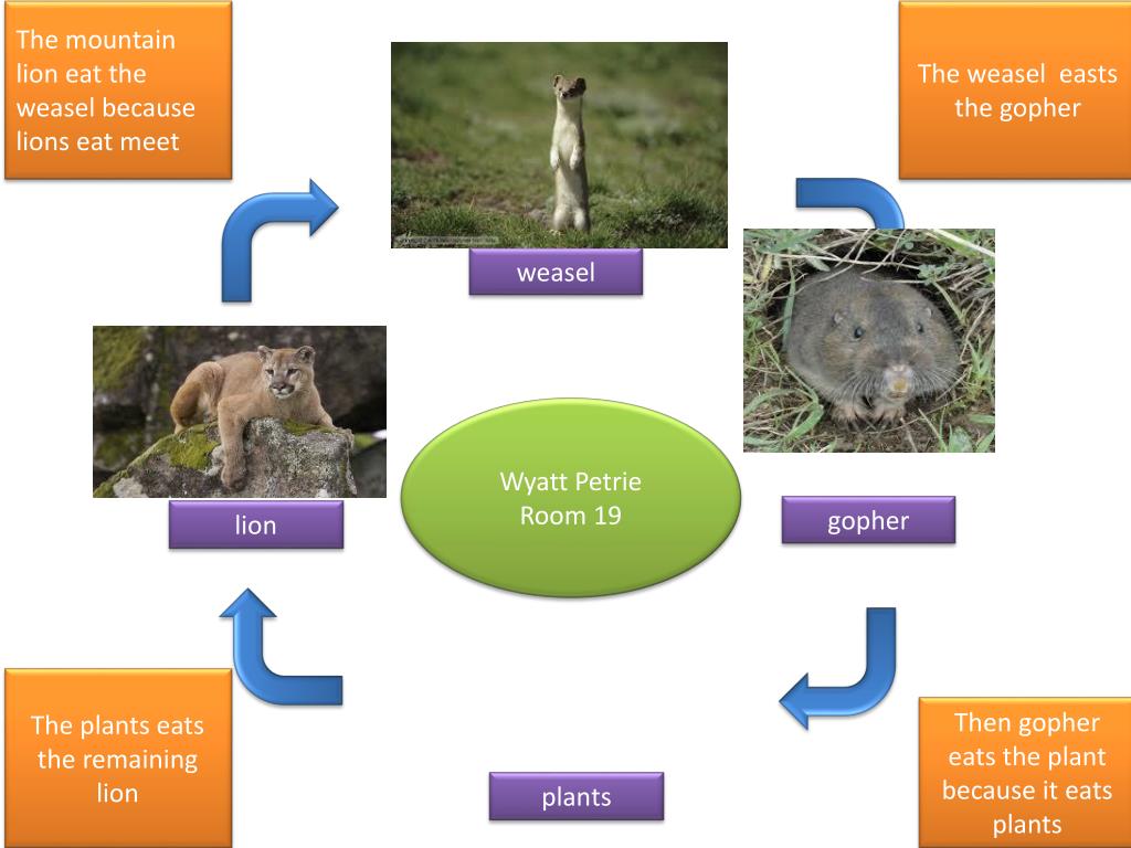 The weasel easts the gopher The mountain lion eat the weasel because lions eat meet weasel Wyatt Petrie Room 19 gopher lion The plants eats the remaining lion Then gopher eats the plant because it eats plants plants