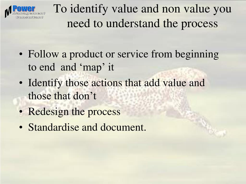 To identify value and non value you need to understand the process • Follow a product or service from beginning to end and ‘map’ it • Identify those actions that add value and those that don’t • Redesign the process • Standardise and document.