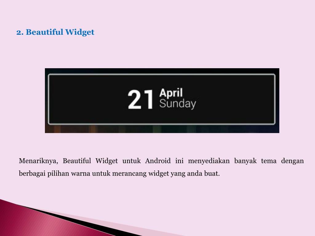 2. Beautiful Widget Menariknya, Beautiful Widget untuk Android inimenyediakanbanyaktemadenganberbagaipilihanwarnauntukmerancang widget yang andabuat.