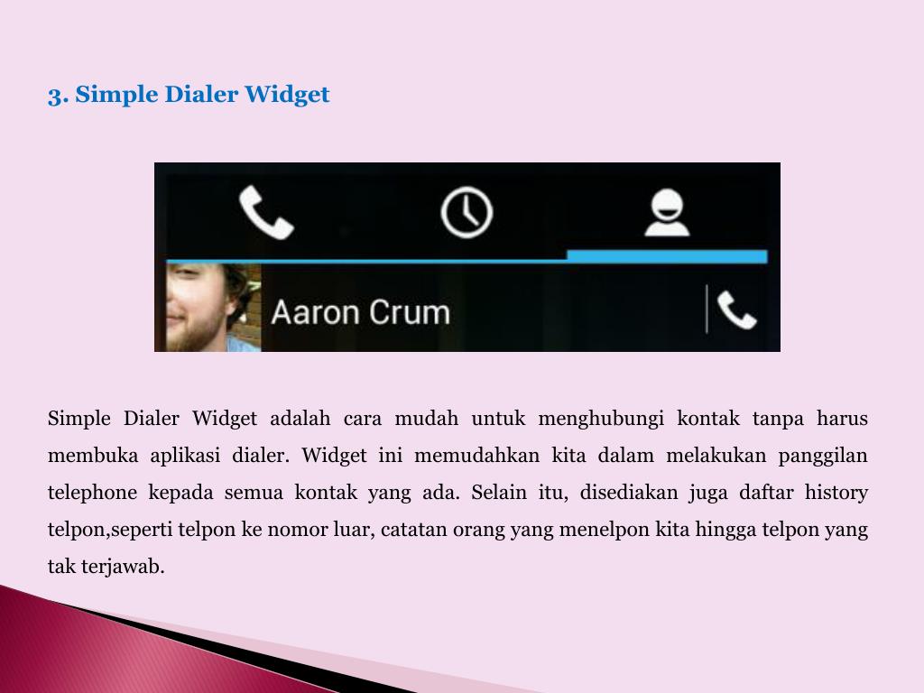 3. Simple Dialer Widget Simple Dialer Widget adalahcaramudahuntukmenghubungikontaktanpaharusmembukaaplikasi dialer. Widget inimemudahkankitadalammelakukanpanggilan telephone kepadasemuakontak yang ada. Selainitu, disediakanjugadaftar history telpon,sepertitelponkenomorluar, catatanorang yang menelponkitahinggatelpon yang takterjawab.