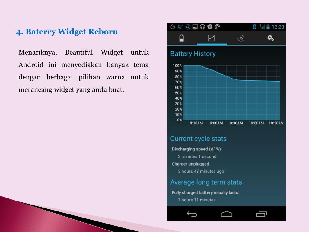 4. Baterry Widget Reborn Menariknya, Beautiful Widget untuk Android inimenyediakanbanyaktemadenganberbagaipilihanwarnauntukmerancang widget yang andabuat.