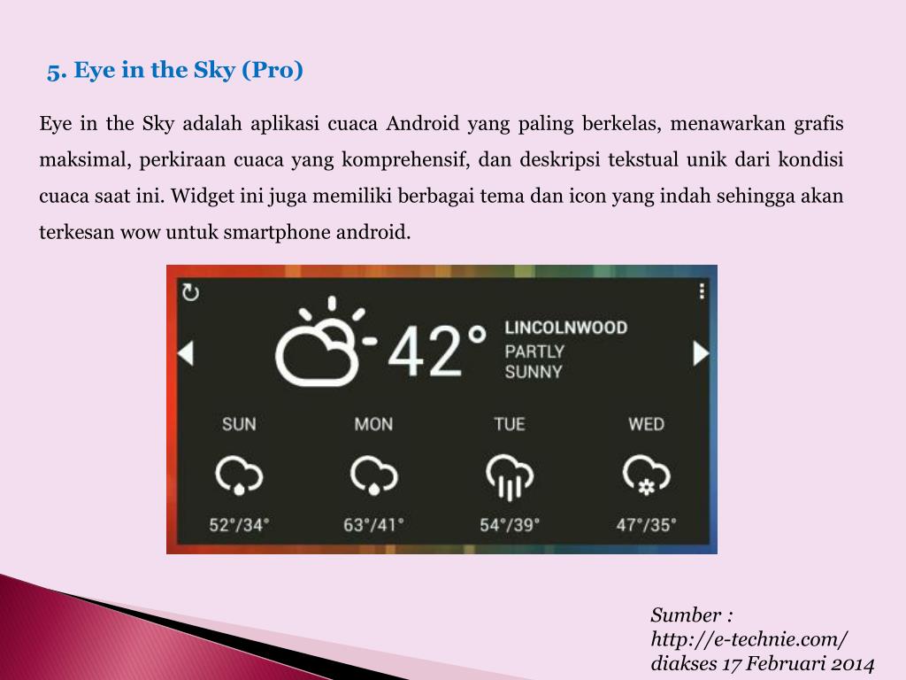 5. Eye in the Sky (Pro) Eye in the Sky adalahaplikasicuaca Android yang paling berkelas, menawarkangrafismaksimal, perkiraancuaca yang komprehensif, dandeskripsitekstualunikdarikondisicuacasaatini. Widget inijugamemilikiberbagaitemadan icon yang indahsehinggaakanterkesanwow untuksmartphoneandroid. Sumber :http://e-technie.com/ diakses17 Februari2014