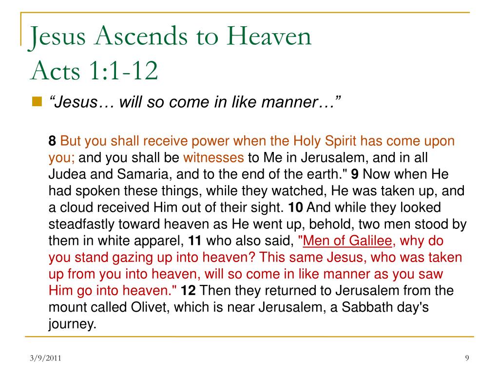 Jesus Ascends to HeavenActs 1:1-12 • “Jesus… will so come in like manner…” 8But you shall receive power when the Holy Spirit has come upon you; and you shall be witnesses to Me in Jerusalem, and in all Judea and Samaria, and to the end of the earth." 9 Now when He had spoken these things, while they watched, He was taken up, and a cloud received Him out of their sight. 10 And while they looked steadfastly toward heaven as He went up, behold, two men stood by them in white apparel, 11 who also said, "Men of Galilee, why do you stand gazing up into heaven? This same Jesus, who was taken up from you into heaven, will so come in like manner as you saw Him go into heaven."12 Then they returned to Jerusalem from the mount called Olivet, which is near Jerusalem, a Sabbath day's journey. 3/9/2011 9