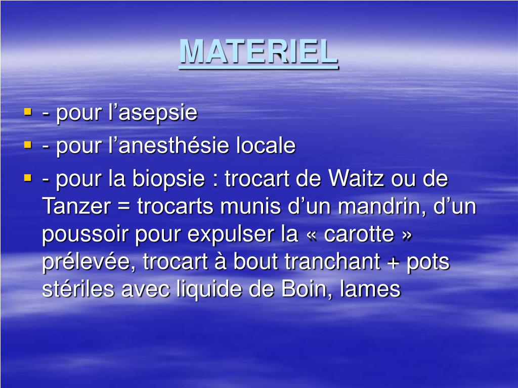 MATERIEL • - pour l’asepsie • - pour l’anesthésie locale • - pour la biopsie : trocart de Waitz ou de Tanzer = trocarts munis d’un mandrin, d’un poussoir pour expulser la « carotte » prélevée, trocart à bout tranchant + pots stériles avec liquide de Boin, lames