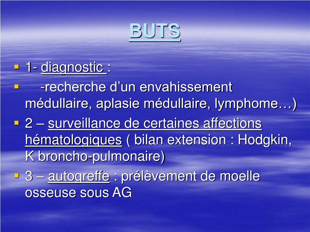 BUTS • 1- diagnostic : • -recherche d’un envahissement médullaire, aplasie médullaire, lymphome…) • 2 – surveillance de certaines affectionshématologiques ( bilan extension : Hodgkin, K broncho-pulmonaire) • 3 – autogreffe : prélèvement de moelle osseuse sous AG