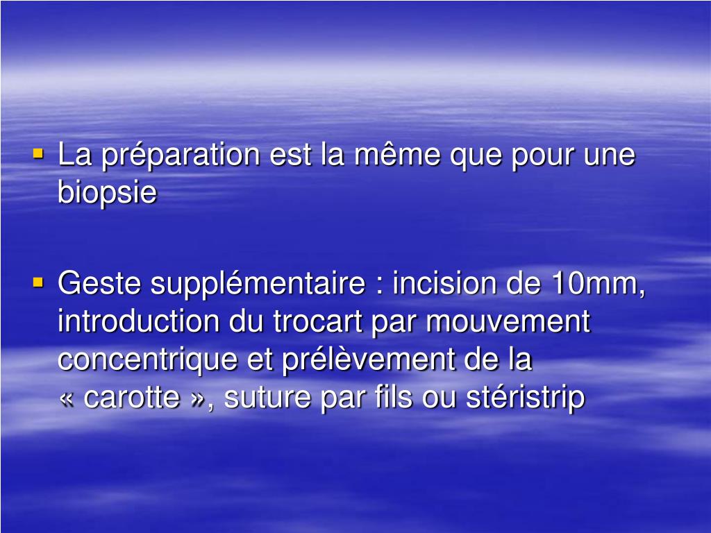 La préparation est la même que pour une biopsie • Geste supplémentaire : incision de 10mm, introduction du trocart par mouvement concentrique et prélèvement de la « carotte », suture par fils ou stéristrip