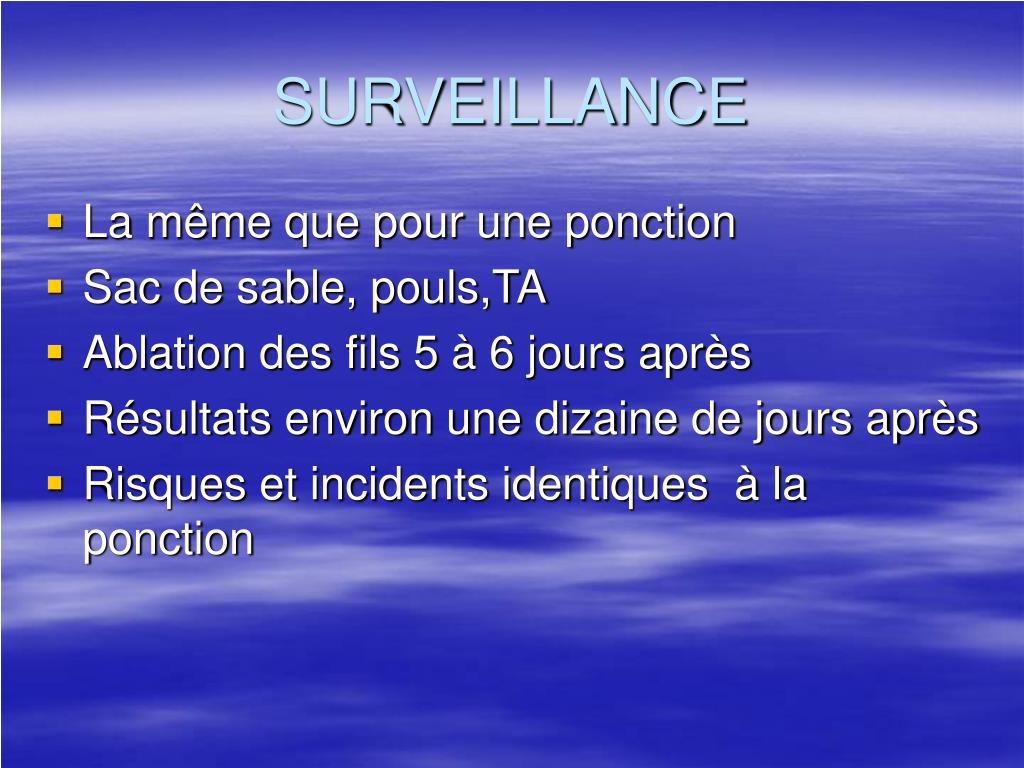 SURVEILLANCE • La même que pour une ponction • Sac de sable, pouls,TA • Ablation des fils 5 à 6 jours après • Résultats environ une dizaine de jours après • Risques et incidents identiques à la ponction