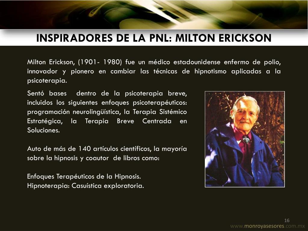 INSPIRADORES DE LA PNL: MILTON ERICKSON Milton Erickson, (1901- 1980) fue un médico estadounidense enfermo de polio, innovador y pionero en cambiar las técnicas de hipnotismo aplicadas a la psicoterapia. Sentó bases dentro de la psicoterapia breve, incluidos los siguientes enfoques psicoterapéuticos: programación neurolingüística, la Terapia Sistémico Estratégica, la Terapia Breve Centrada en Soluciones. Auto de más de 140 artículos científicos, la mayoría sobre la hipnosis y coautor de libros como: Enfoques Terapéuticos de la Hipnosis. Hipnoterapia: Casuística exploratoria. www.monroyasesores.com.mx
