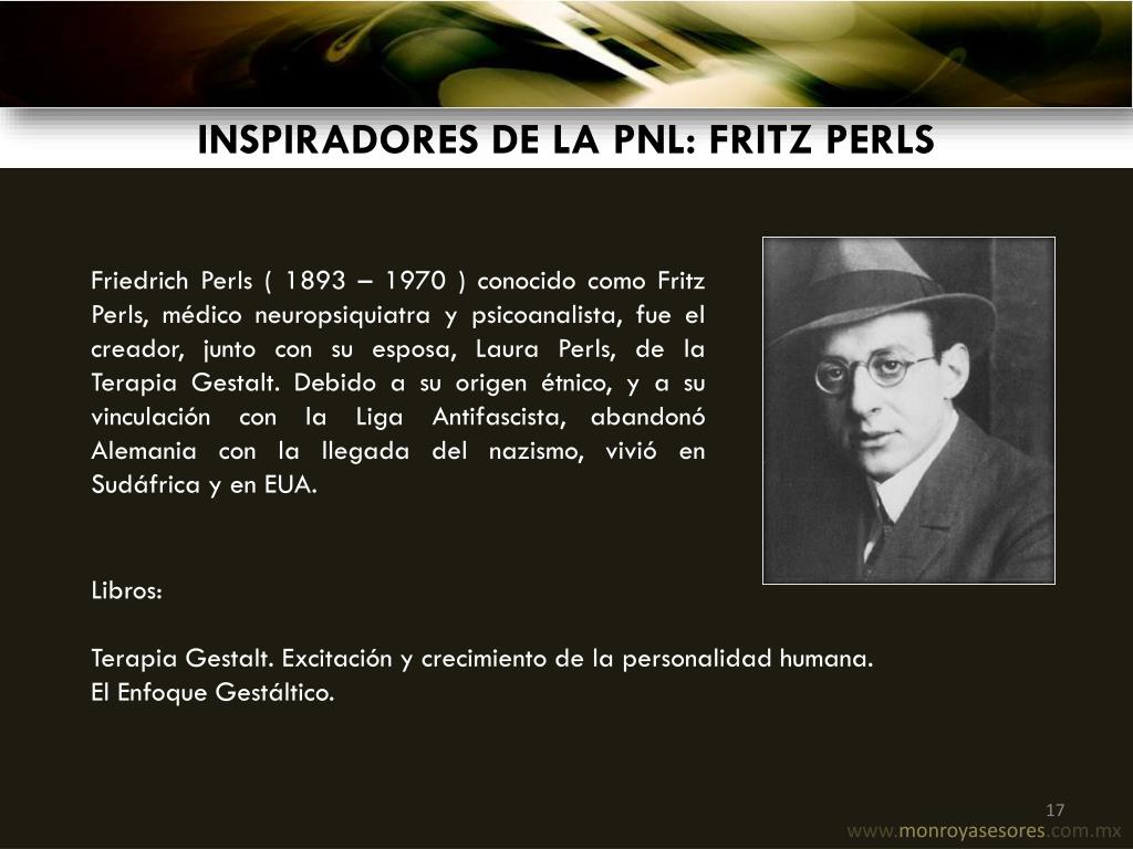 INSPIRADORES DE LA PNL: FRITZ PERLS Friedrich Perls ( 1893 – 1970 ) conocido como Fritz Perls, médico neuropsiquiatra y psicoanalista, fue el creador, junto con su esposa, Laura Perls, de la Terapia Gestalt. Debido a su origen étnico, y a su vinculación con la Liga Antifascista,abandonó Alemania con la llegada del nazismo, vivió en Sudáfrica y en EUA. Libros: Terapia Gestalt. Excitación y crecimiento de la personalidad humana. El Enfoque Gestáltico. www.monroyasesores.com.mx