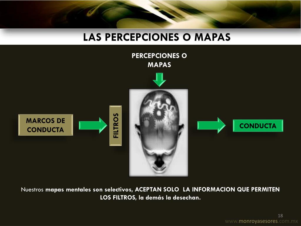 LAS PERCEPCIONES O MAPAS PERCEPCIONES O MAPAS MARCOS DE CONDUCTA CONDUCTA FILTROS Nuestros mapas mentales son selectivos, ACEPTAN SOLO LA INFORMACION QUE PERMITEN LOS FILTROS, la demás la desechan. www.monroyasesores.com.mx