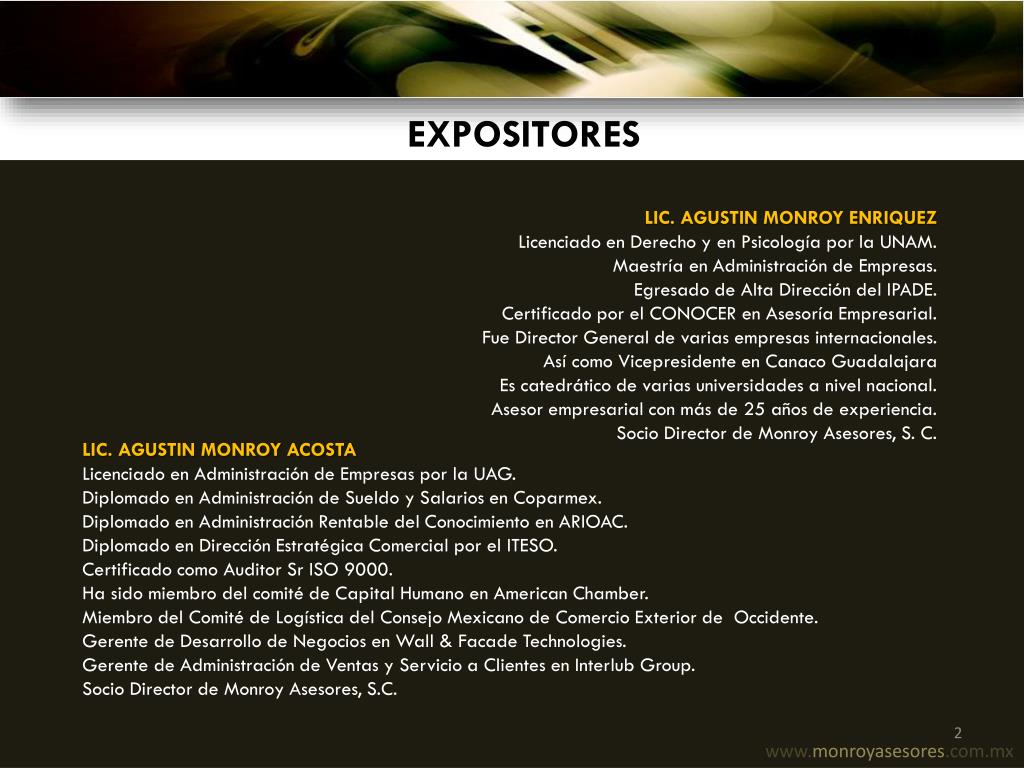 EXPOSITORES LIC. AGUSTIN MONROY ENRIQUEZ Licenciado en Derecho y en Psicología por la UNAM. Maestría en Administración de Empresas. Egresado de Alta Dirección del IPADE. Certificado por el CONOCER en Asesoría Empresarial. Fue Director General de varias empresas internacionales. Así como Vicepresidente en Canaco Guadalajara Es catedrático de varias universidades a nivel nacional. Asesor empresarial con más de 25 años de experiencia. Socio Director de Monroy Asesores, S. C. LIC. AGUSTIN MONROY ACOSTA Licenciado en Administración de Empresas por la UAG. Diplomado en Administración de Sueldo y Salarios en Coparmex. Diplomado en Administración Rentable del Conocimiento en ARIOAC. Diplomado en Dirección Estratégica Comercial por el ITESO. Certificado como Auditor Sr ISO 9000. Ha sido miembro del comité de Capital Humano en American Chamber. Miembro del Comité de Logística del Consejo Mexicano de Comercio Exterior de Occidente. Gerente de Desarrollo de Negocios en Wall & Facade Technologies. Gerente de Administración de Ventas y Servicio a Clientes en Interlub Group. Socio Director de Monroy Asesores, S.C. www.monroyasesores.com.mx
