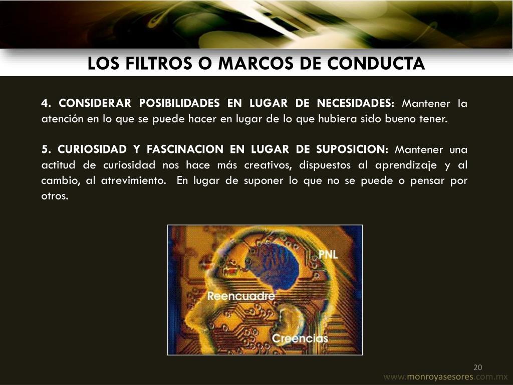 LOS FILTROS O MARCOS DE CONDUCTA 4. CONSIDERAR POSIBILIDADES EN LUGAR DE NECESIDADES: Mantener la atención en lo que se puede hacer en lugar de lo que hubiera sido bueno tener. 5. CURIOSIDAD Y FASCINACION EN LUGAR DE SUPOSICION: Mantener una actitud de curiosidad nos hace más creativos, dispuestos al aprendizaje y al cambio, al atrevimiento. En lugar de suponer lo que no se puede o pensar por otros. www.monroyasesores.com.mx