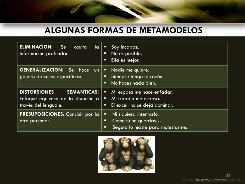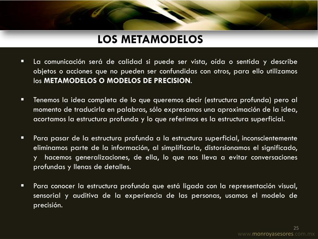 LOS METAMODELOS • La comunicación será de calidad si puede ser vista, oída o sentida y describe objetos o acciones que no pueden ser confundidas con otros, para ello utilizamos los METAMODELOS O MODELOS DE PRECISION. • Tenemos la idea completa de lo que queremos decir (estructura profunda) pero al momento de traducirla en palabras, sólo expresamos una aproximación de la idea, acortamos la estructura profunda y lo que referimos es la estructura superficial. • Para pasar de la estructura profunda a la estructura superficial, inconscientemente eliminamos parte de la información, al simplificarla, distorsionamos el significado, y hacemos generalizaciones, de ella, lo que nos lleva a evitar conversaciones profundas y llenas de detalles. • Para conocer la estructura profunda que está ligada con la representación visual, sensorial y auditiva de la experiencia de las personas, usamos el modelo de precisión. www.monroyasesores.com.mx