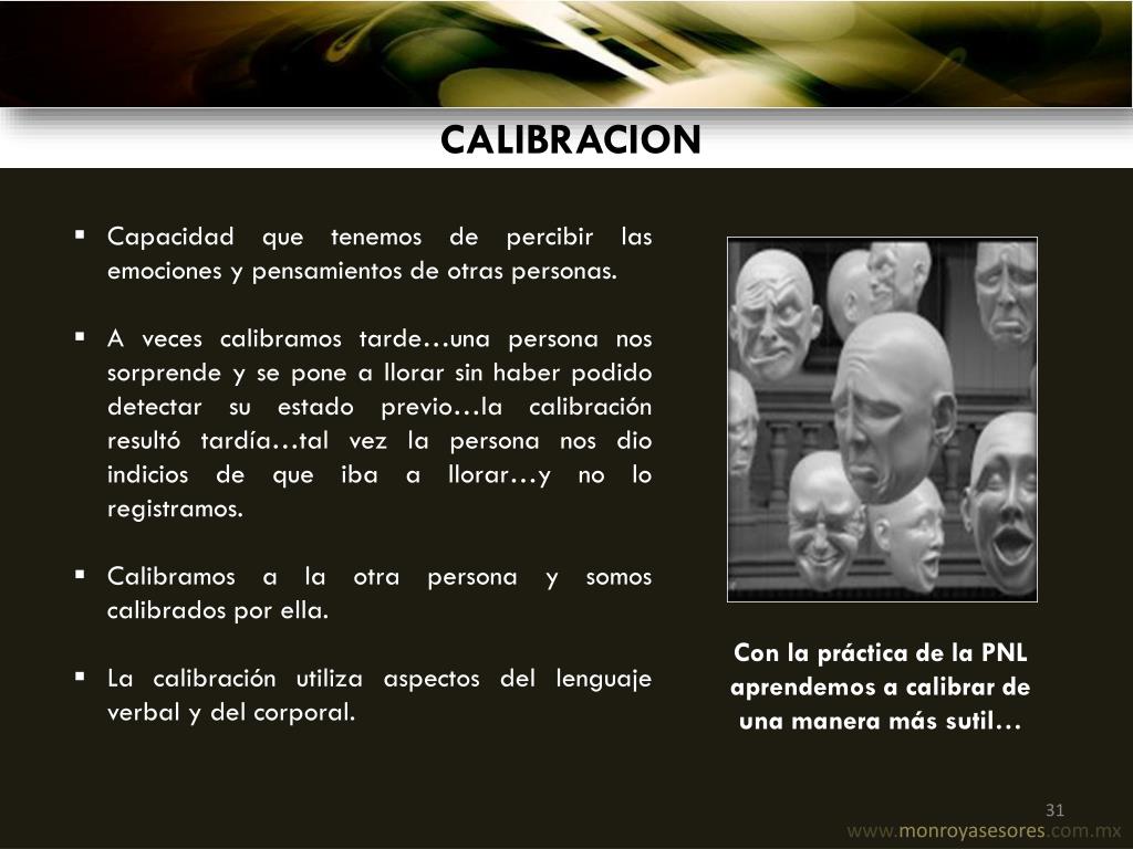 CALIBRACION • Capacidad que tenemos de percibir las emociones y pensamientos de otras personas. • A veces calibramos tarde…una persona nos sorprende y se pone a llorar sin haber podido detectar su estado previo…la calibración resultó tardía…tal vez la persona nos dio indicios de que iba a llorar…y no lo registramos. • Calibramos a la otra persona y somos calibrados por ella. • La calibración utiliza aspectos del lenguaje verbal y del corporal. Con la práctica de la PNL aprendemos a calibrar de una manera más sutil… www.monroyasesores.com.mx