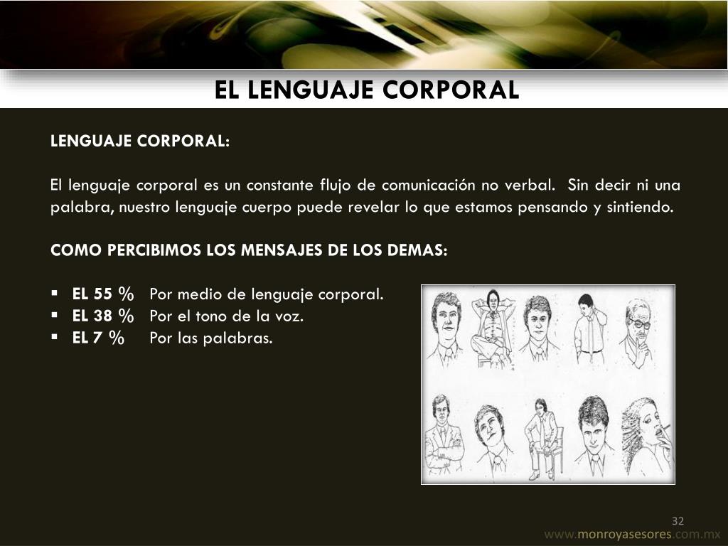 EL LENGUAJE CORPORAL • LENGUAJE CORPORAL: • El lenguaje corporal es un constante flujo de comunicación no verbal. Sin decir ni una palabra, nuestro lenguaje cuerpo puede revelar lo que estamos pensando y sintiendo. • COMO PERCIBIMOS LOS MENSAJES DE LOS DEMAS: • EL 55 % Por medio de lenguaje corporal. • EL 38 % Por el tono de la voz. • EL 7 % Por las palabras. www.monroyasesores.com.mx