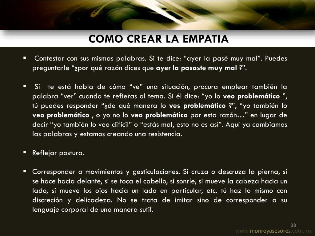 COMO CREAR LA EMPATIA • Contestar con sus mismas palabras. Si te dice: “ayer la pasé muy mal”. Puedes preguntarle “¿por qué razón dices que ayer la pasaste muy mal ?”. • Si te está habla de cómo “ve” una situación, procura emplear también la palabra “ver” cuando te refieras al tema. Si él dice: “yo lo veo problemático ”, tú puedes responder “¿de qué manera lo ves problemático ?”, “yo también lo veo problemático , o yo no lo veo problemático por esta razón…” en lugar de decir “yo también lo veo difícil” o “estás mal, esto no es así”. Aquí ya cambiamos las palabras y estamos creando una resistencia. • Reflejar postura. • Corresponder a movimientos y gesticulaciones. Si cruza o descruza la pierna, si se hace hacia delante, si se toca el cabello, si sonríe, si mueve la cabeza hacia un lado, si mueve los ojos hacia un lado en particular, etc. tú haz lo mismo con discreción y delicadeza. No se trata de imitar sino de corresponder a su lenguaje corporal de una manera sutil. www.monroyasesores.com.mx