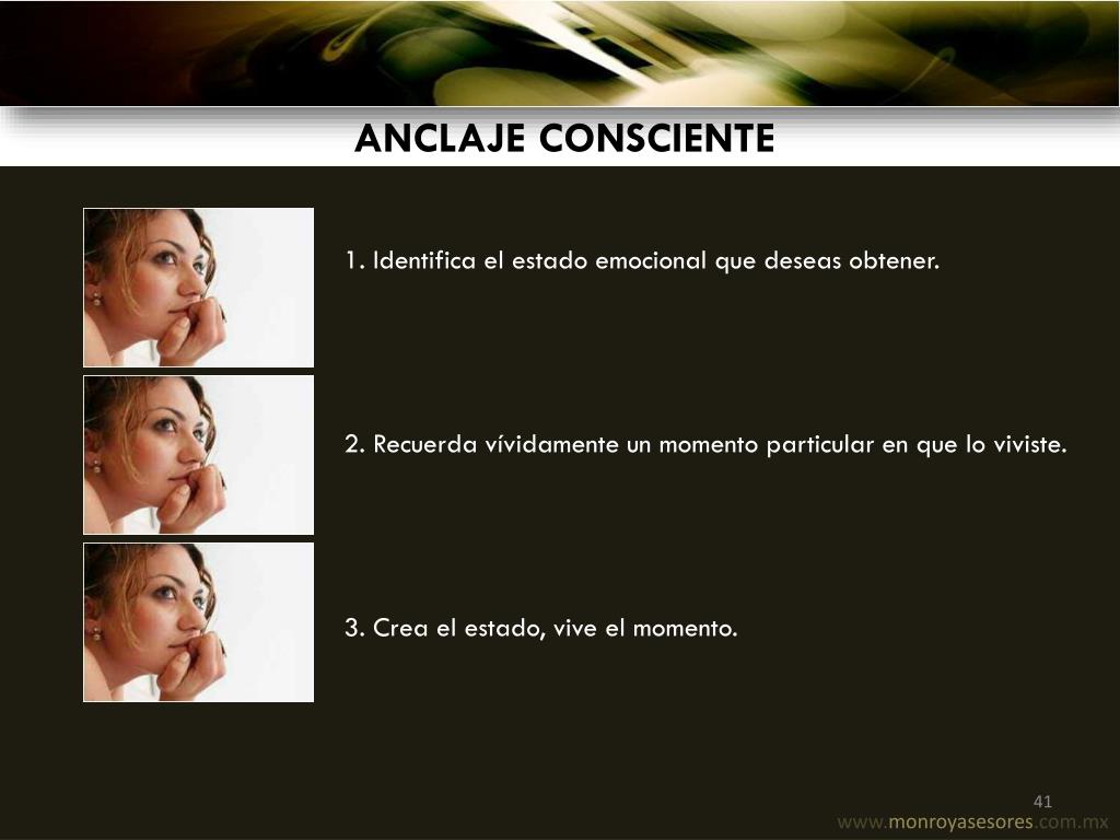 ANCLAJE CONSCIENTE 1. Identifica el estado emocional que deseas obtener. 2. Recuerda vívidamente un momento particular en que lo viviste. 3. Crea el estado, vive el momento. www.monroyasesores.com.mx