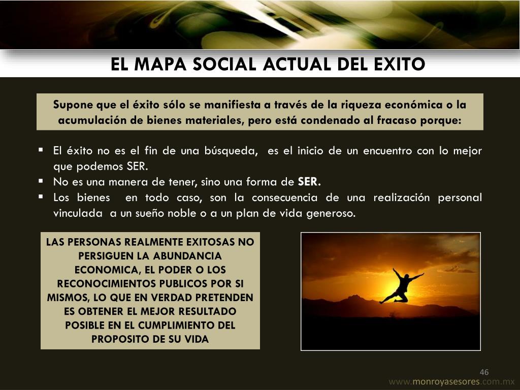 EL MAPA SOCIAL ACTUAL DEL EXITO Supone que el éxito sólo se manifiesta a través de la riqueza económica o la acumulación de bienes materiales, pero está condenado al fracaso porque: • El éxito no es el fin de una búsqueda, es el inicio de un encuentro con lo mejor que podemos SER. • No es una manera de tener, sino una forma de SER. • Los bienes en todo caso, son la consecuencia de una realización personal vinculada a un sueño noble o a un plan de vida generoso. LAS PERSONAS REALMENTE EXITOSAS NO PERSIGUEN LA ABUNDANCIA ECONOMICA, EL PODER O LOS RECONOCIMIENTOS PUBLICOS POR SI MISMOS, LO QUE EN VERDAD PRETENDEN ES OBTENER EL MEJOR RESULTADO POSIBLE EN EL CUMPLIMIENTO DEL PROPOSITO DE SU VIDA www.monroyasesores.com.mx