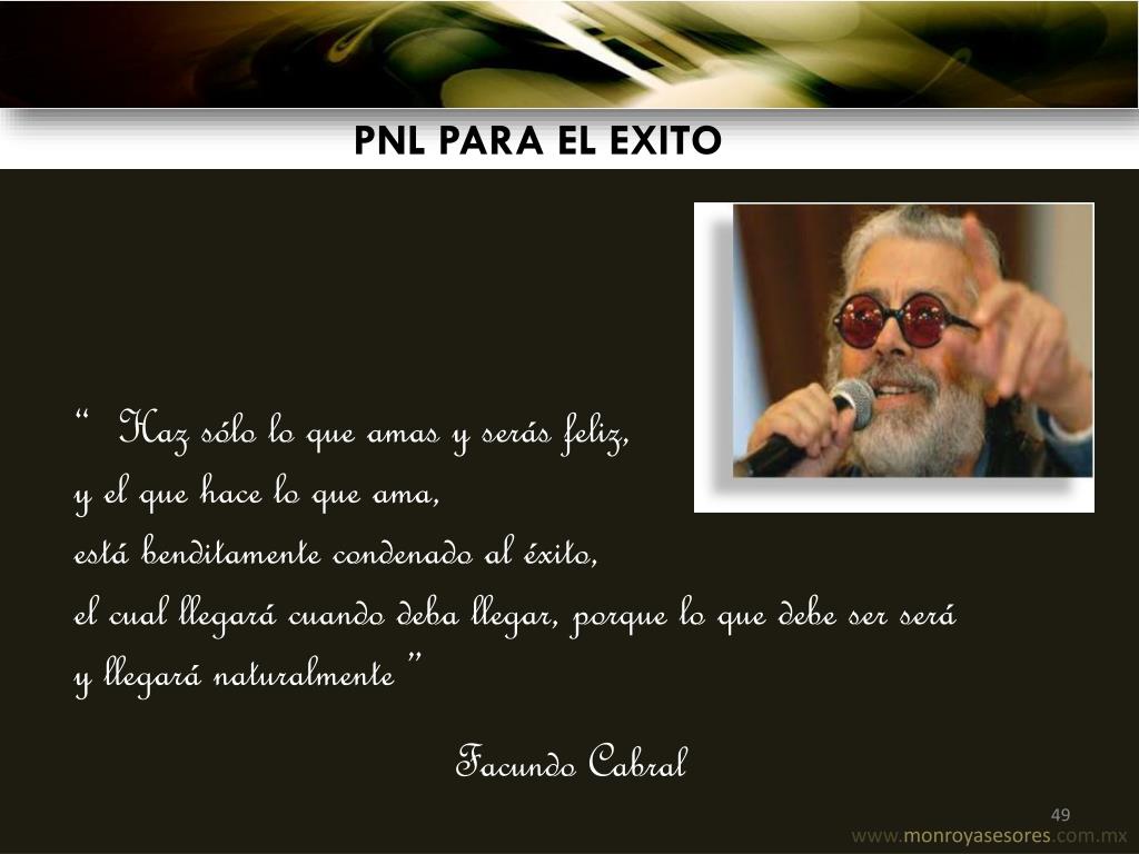 PNL PARA EL EXITO “ Haz sólo lo que amas y serás feliz, y el que hace lo que ama, está benditamente condenado al éxito, el cual llegará cuando deba llegar, porque lo que debe ser será y llegará naturalmente ” Facundo Cabral www.monroyasesores.com.mx
