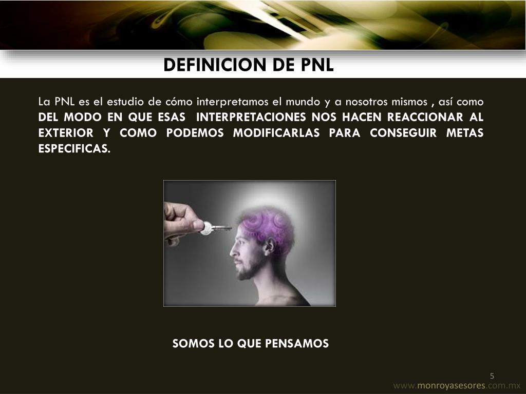 DEFINICION DE PNL La PNL es el estudio de cómo interpretamos el mundo y a nosotros mismos , así como DEL MODO EN QUE ESAS INTERPRETACIONES NOS HACEN REACCIONAR AL EXTERIOR Y COMO PODEMOS MODIFICARLAS PARA CONSEGUIR METAS ESPECIFICAS. SOMOS LO QUE PENSAMOS www.monroyasesores.com.mx